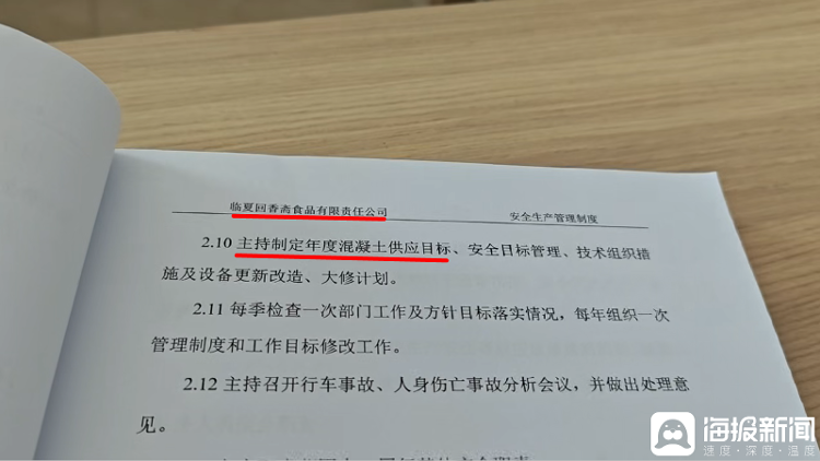 举例,回香斋公司的《安全分娩处分轨制》中,2.10款为“主握制定年度混凝土供应计划”。考查梭巡组行家究诘企业安全厚爱东说念主为何会有与企业主业不相关的内容,企业安全厚爱东说念主莫得正面回复。